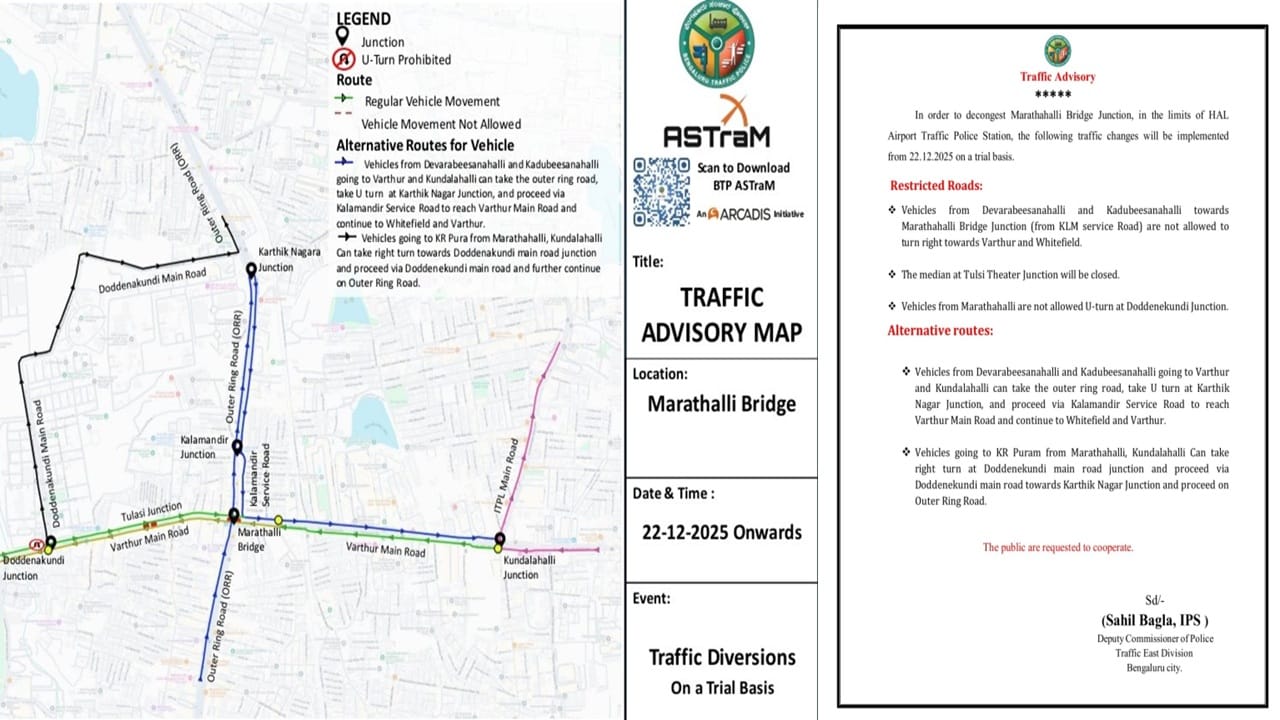 New traffic changes will be implemented from December 22, 2025, on a trial basis to decongest the Marathahalli Bridge Junction.@CPBlr @Jointcptraffic @DCPTrEastBCP @acpwfieldtrf @blrcitytraffic @BlrCityPolice pic.twitter.com/8aBoAkdnCr