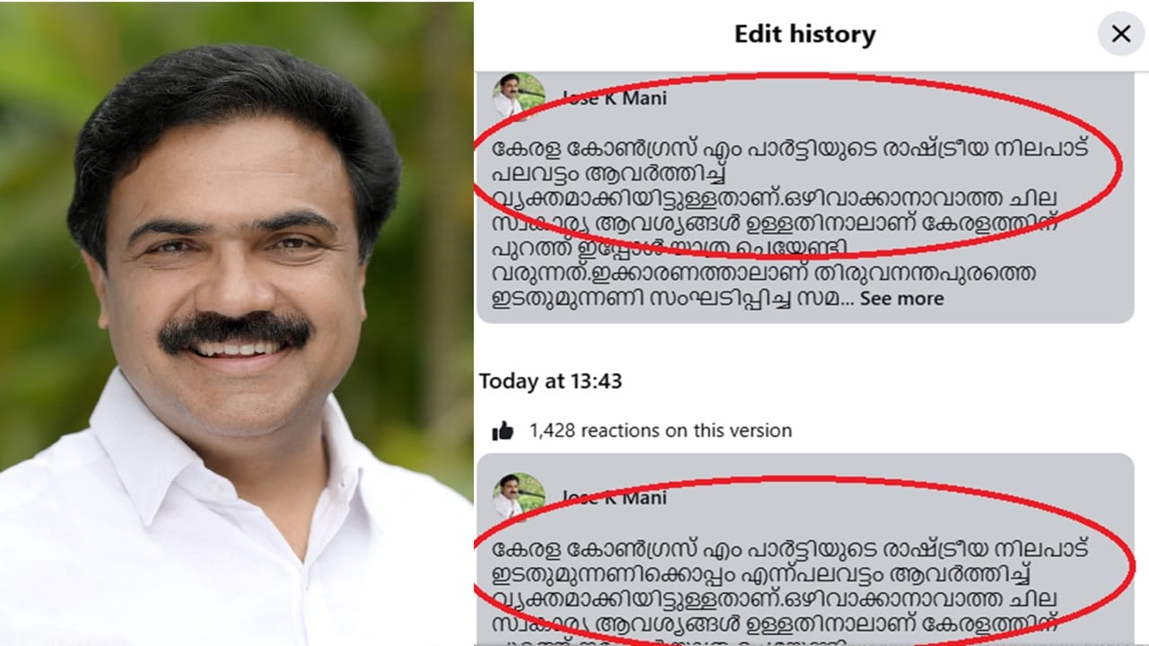 Jose K Mani edits facebook post: ജോസ് കെ മാണി ആദ്യം ഫേസ്ബുക്കില് പങ്കുവച്ച കുറിപ്പ് അവ്യക്തതകള് നിറഞ്ഞതായിരുന്നു. കേരള കോണ്ഗ്രസ് എം ഇടതുമുന്നണിക്കൊപ്പമെന്ന നിലപാട് അതില് ഇല്ലായിരുന്നു. പിന്നീട് ഫേസ്ബുക്ക് പോസ്റ്റ് എഡിറ്റ് ചെയ്തു.