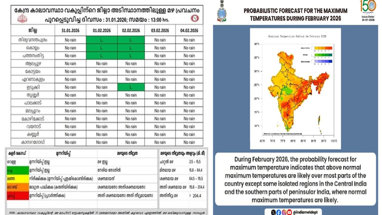 ഫെബ്രുവരിയിൽ രാജ്യത്തുടനീളം പ്രതിമാസ മഴ സാധാരണയിലും താഴെയായിരിക്കാനാണ് സാധ്യത. നോര്ത്ത് വെസ്റ്റ്, ഈസ്റ്റ് സെന്ട്രല് തുടങ്ങിയ പ്രദേശങ്ങളില് സാധാരണയോ അതില് കൂടുതലോ മഴ ലഭിച്ചേക്കാം. ഫെബ്രുവരിയിൽ രാജ്യത്തിന്റെ മിക്ക ഭാഗങ്ങളിലും താപനില സാധാരണയേക്കാൾ കൂടുതലായിരിക്കുമെന്നാണ് മുന്നറിയിപ്പ്. കേരളത്തില് വടക്കന് ജില്ലകളിലാണ് കൂടുതല് താപനിലയ്ക്ക് സാധ്യത.
