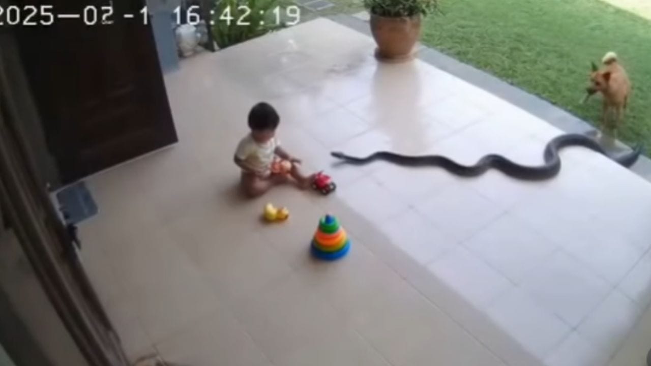 വീടിന്റെ സിറ്റൗട്ടില് ഇരുന്ന് കളിക്കുകയാണ് കുട്ടി, കാഴ്ചയില് ഒന്നോ രണ്ടോ വയസ് തോന്നിക്കും. കുട്ടിക്ക് സമീപത്തായി മുറ്റത്ത് വളര്ത്തുനായയെയും കാണാം. കളിപ്പാട്ടങ്ങളുമായി കളിക്കുന്ന കുട്ടിക്ക് അരികിലേക്കാണ് പെട്ടെന്ന് പാമ്പെത്തിയത്. എന്നാല് ആ കുരുന്നിന് എന്താണ് തന്റെ അടുത്തേക്ക് വരുന്നതെന്ന് മനസിലാക്കാനായില്ല.